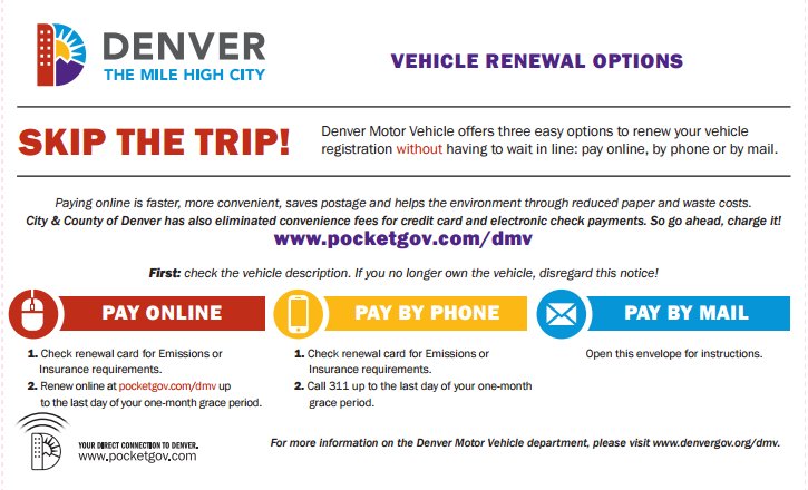 Michael B Hancock On Twitter Skip The Trip Denvermotorvehicle Has A New Reminder Card To Make It Easier For Customers To Read And Renew Their Vehicle S Registration Https T Co Xibazqpjwo